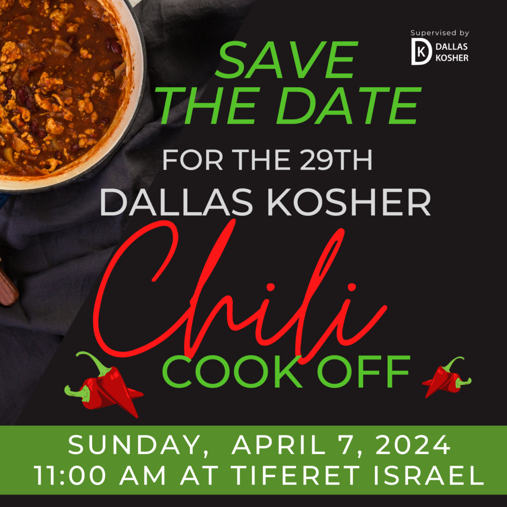 Started in 1994, the Dallas Kosher Chili Cookoff is the oldest and largest Kosher Chili Cookoff event in the world. This year will be the 30th (sadly, we had to skip 2 years for COVID) and is held annually on the Tiferet Israel campus at 10909 Hillcrest Road near Royal Lane.